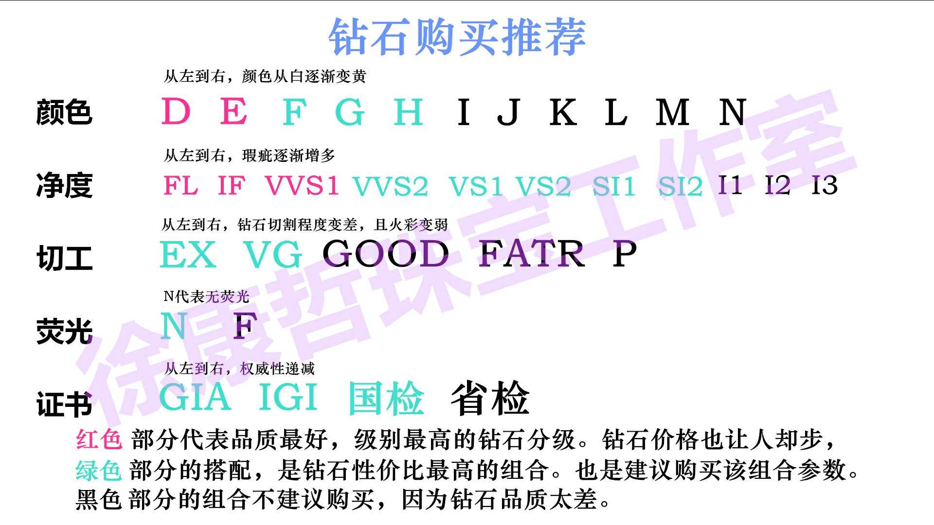 美国珠宝学院GIA对于钻石颜色等级有以下分级:D(极白色+)、E(极白)、F(很白+)、